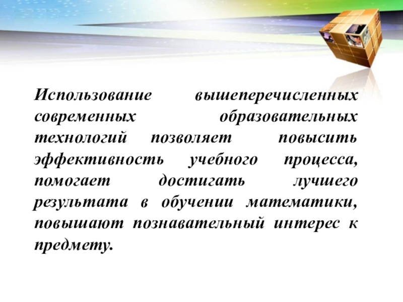 Использование вышеперечисленных современных образовательных технологий позволяет повысить эффективность учебного процесса, помогает достигать лучшего результата в обучении математики, повышают познавательный интерес к предмету.