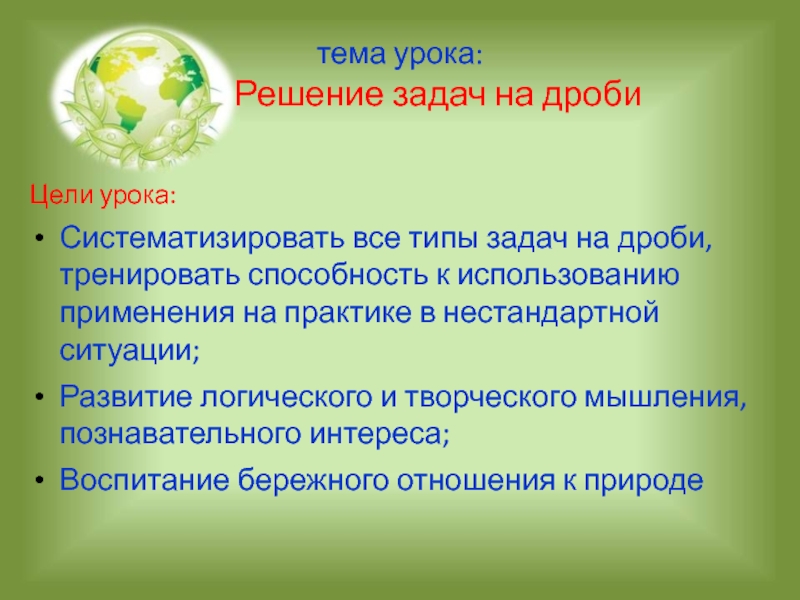 Систематизировать все типы задач на дроби, тренировать способность к использованию применения на практике в нестандартной ситуации;