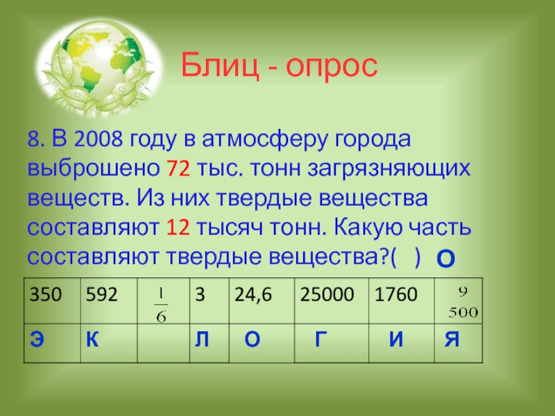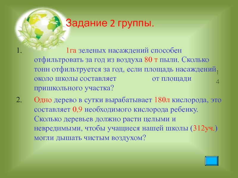 1га зеленых насаждений способен отфильтровать за год из воздуха 80 т пыли. Сколько тонн отфильтруется за год, если площадь насаждений около школы составляет от площади пришкольного участка?