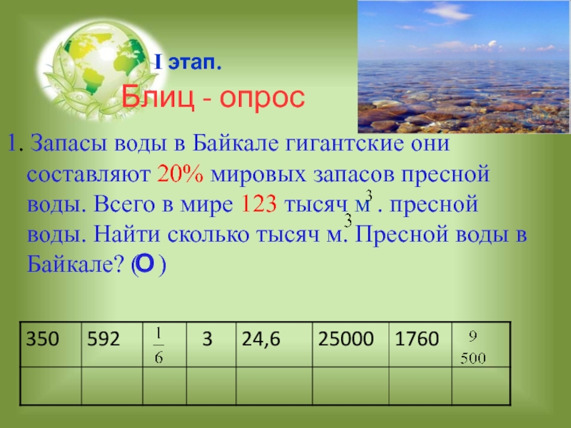 1. Запасы воды в Байкале гигантские они составляют 20% мировых запасов пресной воды. Всего в мире 123 тысяч м . пресной воды. Найти сколько тысяч м. Пресной воды в Байкале? ( )