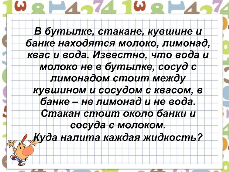 Слайд 19В бутылке, стакане, кувшине и банке находятся молоко, лимонад, квас и