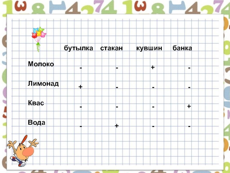 вода. Известно, что вода и молоко не в бутылке, сосуд с лимонадом стоит между кувшином и сосудом с квасом, в банке – не лимонад и не вода. Стакан стоит около банки и сосуда с молоком.