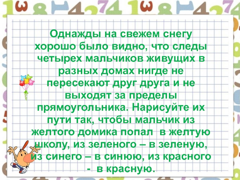живущих в разных домах нигде не пересекают друг друга и не выходят за пределы прямоугольника. Нарисуйте их пути так, чтобы мальчик из желтого домика попал в желтую школу, из зеленого – в зеленую, из синего – в синюю, из красного - в красную.