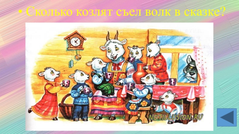Слайд 5• Сколько козлят съел волк в сказке?