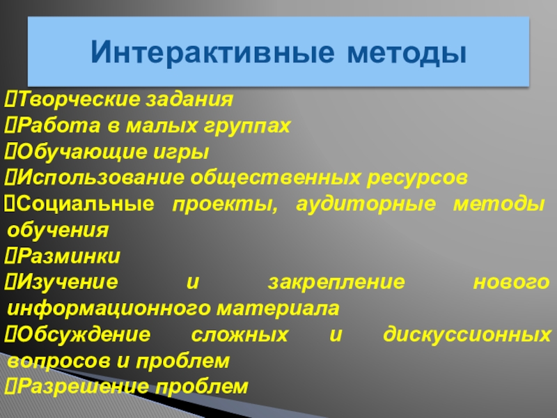 Интерактивные методыТворческие заданuяРабота в малых группахОбучающие игрыИспользованuе общественных ресурсов Социальные проекты, аудиторные методы обученияРазминкиИзучение u закрепление нового
