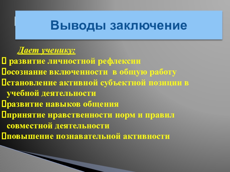 Выводы, заключениеВыводы заключениеДает ученику: развитие личностной рефлексииосознание включенности  в общую работустановление активной субъектной позиции в учебной деятельностиразвитие навыков
