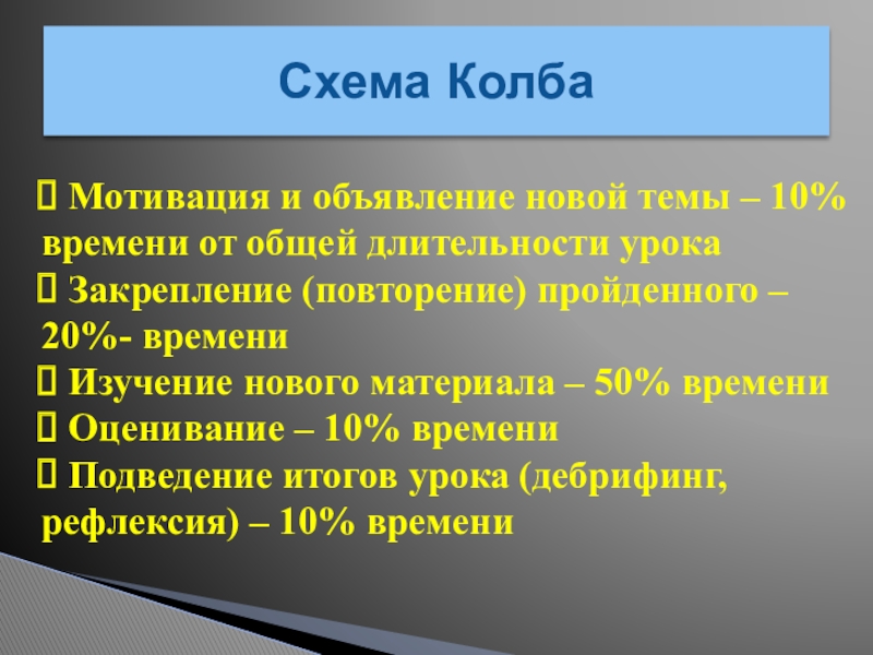 Схема Колба Мотивация и объявление новой темы – 10% времени от общей длительности урока Закрепление (повторение) пройденного