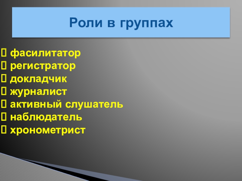 фасилитатор регистратор докладчик журналист активный слушатель наблюдатель хронометристРоли в группах