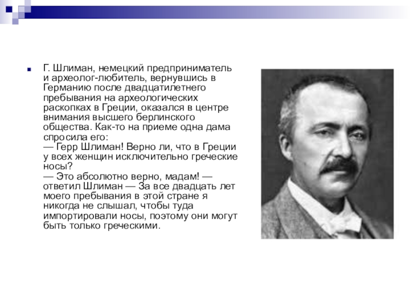 пребывания на археологических раскопках в Греции, оказался в центре внимания высшего берлинского общества. Как-то на приеме одна дама спросила его: