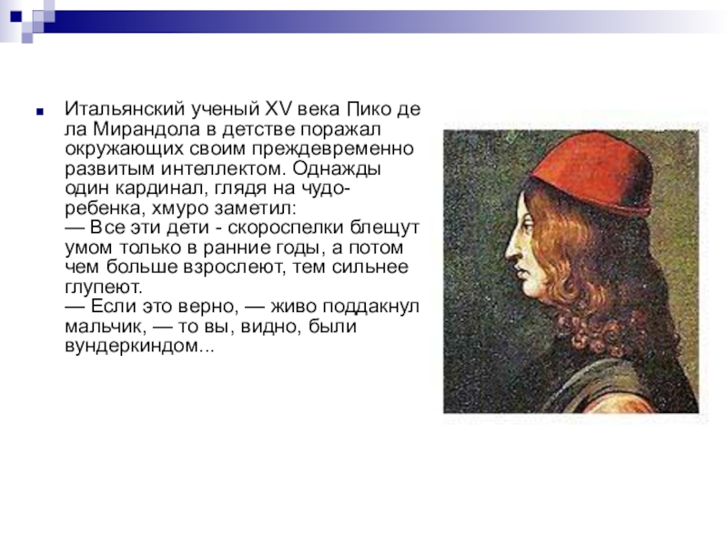 Слайд 8Итальянский ученый XV века Пико де ла Мирандола в детстве поражал