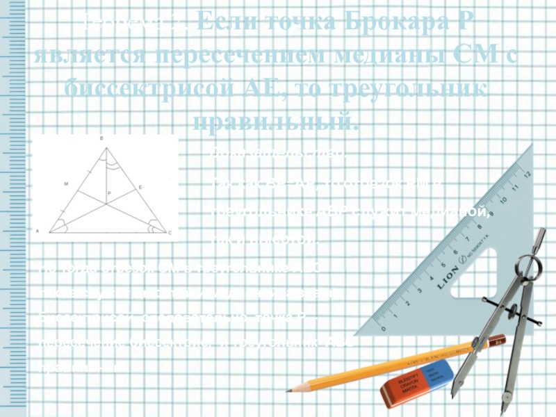 Теорема 2. Если точка Брокара Р является пересечением медианы СМ с биссектрисой АЕ, то треугольник правильный.