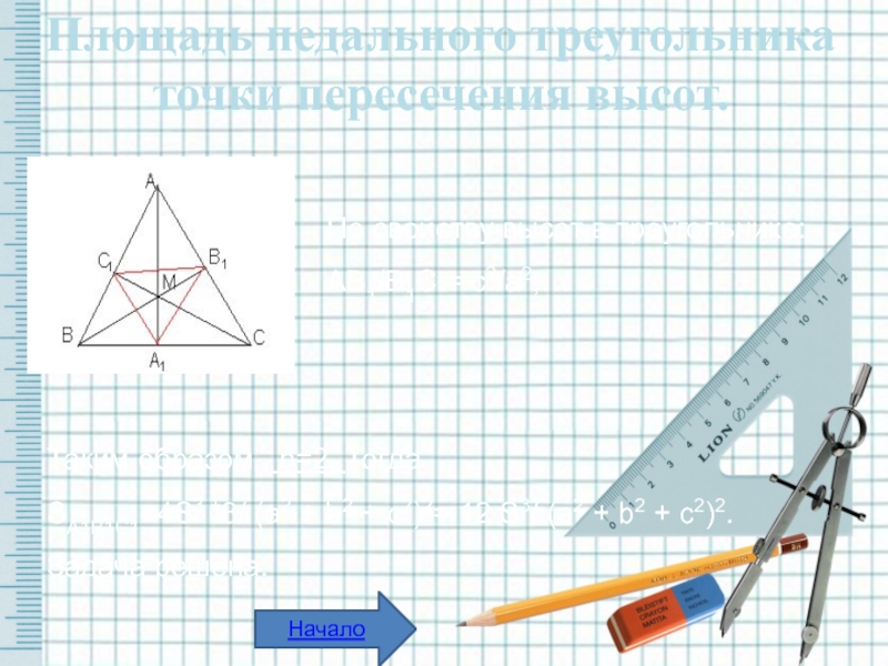 Дано: треугольник АВС, а, b, с – стороны треугольника АВС, – педальная точка, la, lb, lc – перпендикуляры от L, ha, hb, hc – высоты треугольника АВС.