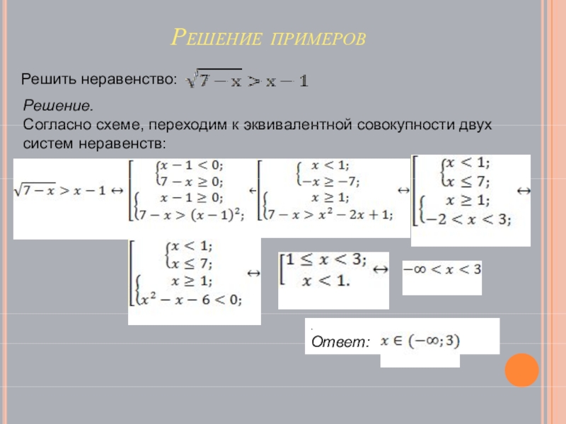 .Ответ: Решение примеров Решить неравенство:Решение.Согласно схеме, переходим к эквивалентной совокупности двух систем неравенств:  .