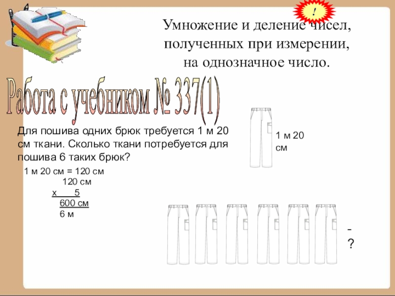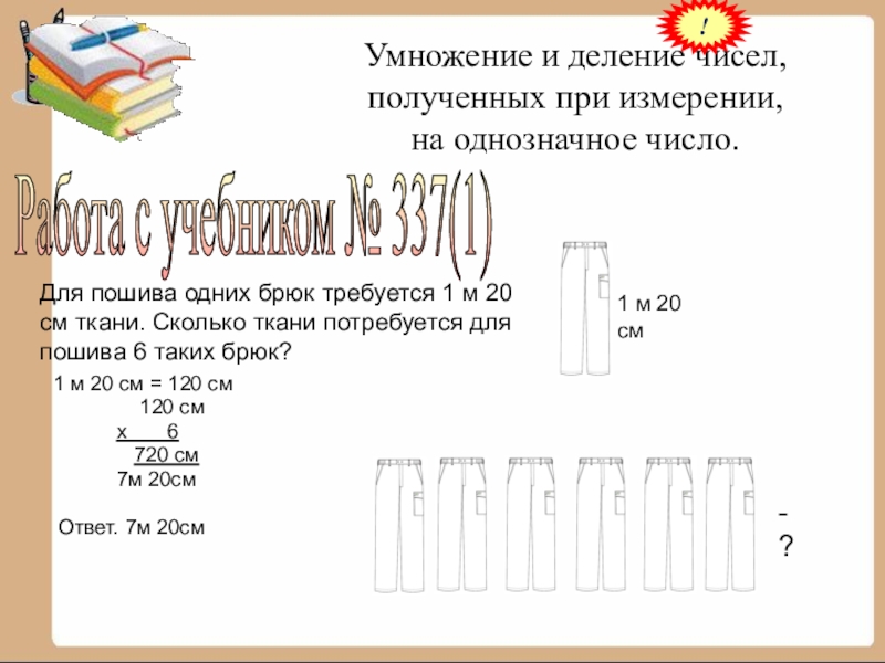 Для пошива одних брюк требуется 1 м 20 см ткани. Сколько ткани потребуется для пошива 6 таких брюк?