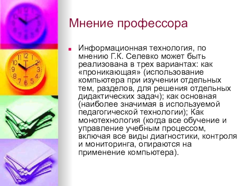 трех вариантах: как «проникающая» (использование компьютера при изучении отдельных тем, разделов, для решения отдельных дидактических задач); как основная (наиболее значимая в используемой педагогической технологии); Как монотехнология (когда все обучение и управление учебным процессом, включая все виды диагностики, контроля и мониторинга, опираются на применение компьютера).