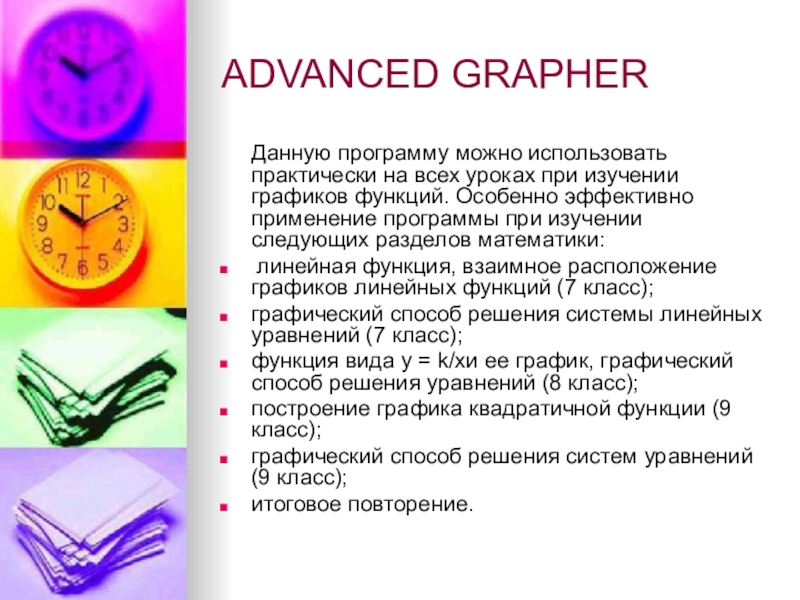 уроках при изучении графиков функций. Особенно эффективно применение программы при изучении следующих разделов математики: