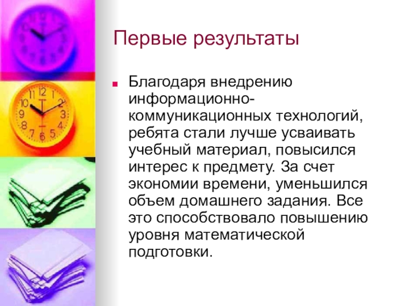 повысился интерес к предмету. За счет экономии времени, уменьшился объем домашнего задания. Все это способствовало повышению уровня математической подготовки.