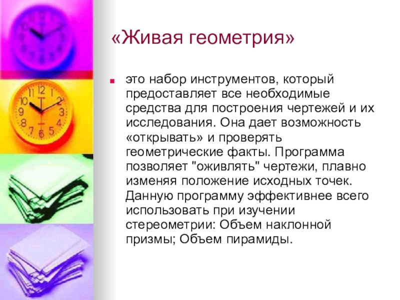 построения чертежей и их исследования. Она дает возможность «открывать» и проверять геометрические факты. Программа позволяет "оживлять" чертежи, плавно изменяя положение исходных точек. Данную программу эффективнее всего использовать при изучении стереометрии: Объем наклонной призмы; Объем пирамиды.