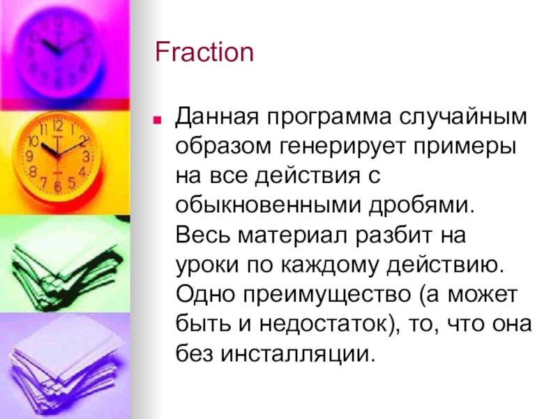 обыкновенными дробями. Весь материал разбит на уроки по каждому действию. Одно преимущество (а может быть и недостаток), то, что она без инсталляции.