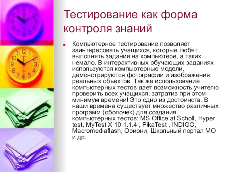 выполнять задания на компьютере, а таких немало. В интерактивных обучающих заданиях используются компьютерные модели, демонстрируются фотографии и изображения реальных объектов. Так же использование компьютерных тестов дает возможность учителю проверить всех учащихся, затратив при этом минимум времени! Это одно из достоинств. В наши времена существует множество различных программ (оболочек) для создания компьютерных тестов: MS Office at Scholl, Hyper test, MyTest X 10.1.1.4 , PikaTest , INDIGO, Macromediaflash, Ориони, Школьный портал МО и др.