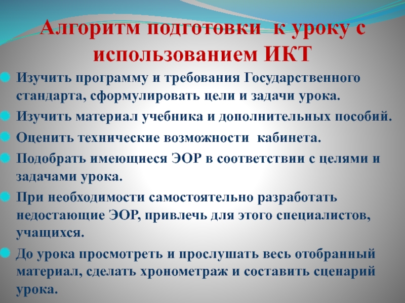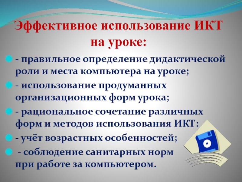 - рациональное сочетание различных форм и методов использования ИКТ: