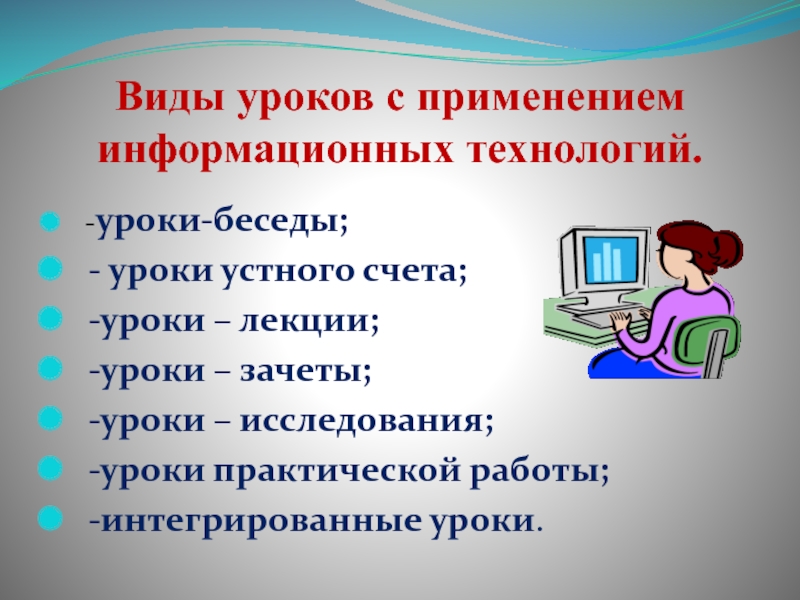 - правильное определение дидактической роли и места компьютера на уроке;