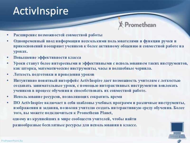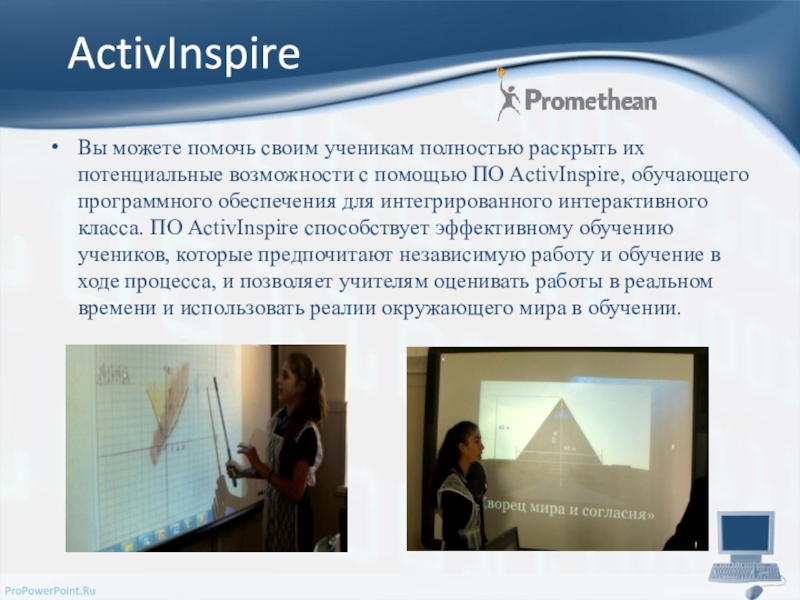 помощью ПО ActivInspire, обучающего программного обеспечения для интегрированного интерактивного класса. ПО ActivInspire способствует эффективному обучению учеников, которые предпочитают независимую работу и обучение в ходе процесса, и позволяет учителям оценивать работы в реальном времени и использовать реалии окружающего мира в обучении.