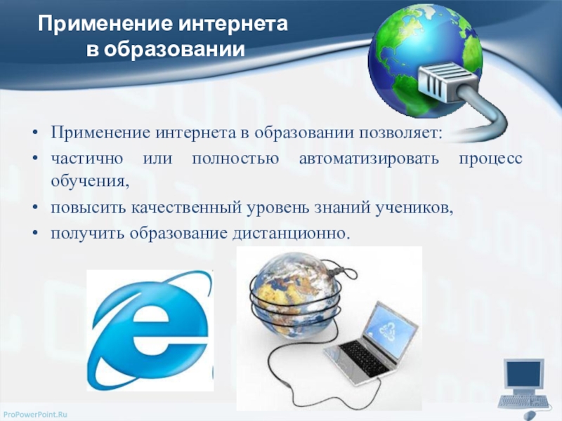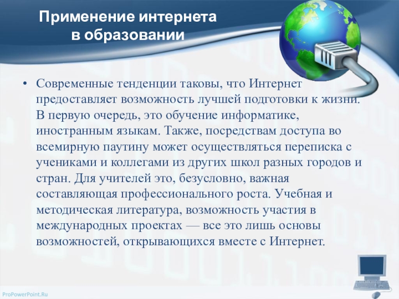 подготовки к жизни. В первую очередь, это обучение информатике, иностранным языкам. Также, посредствам доступа во всемирную паутину может осуществляться переписка с учениками и коллегами из других школ разных городов и стран. Для учителей это, безусловно, важная составляющая профессионального роста. Учебная и методическая литература, возможность участия в международных проектах — все это лишь основы возможностей, открывающихся вместе с Интернет.