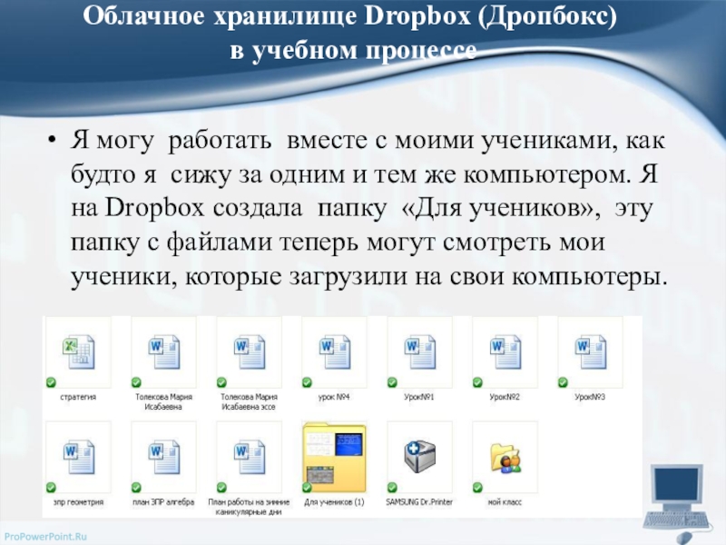 с моими учениками, как будто я сижу за одним и тем же компьютером. Я на Dropbox создала папку «Для учеников», эту папку с файлами теперь могут смотреть мои ученики, которые загрузили на свои компьютеры.