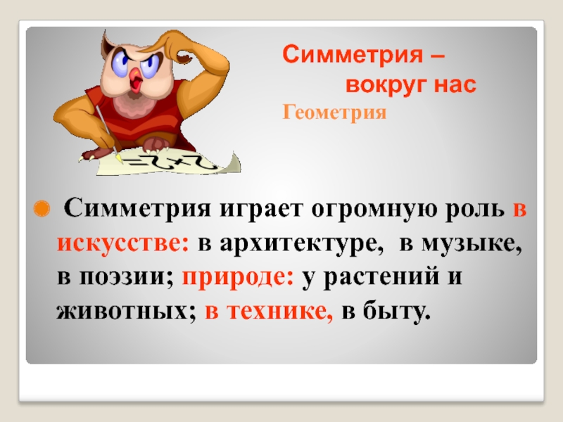 Симметрия играет огромную роль в искусстве: в архитектуре, в музыке, в поэзии; природе: у растений и животных; в технике, в быту.