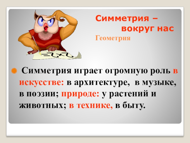 Симметрия играет огромную роль в искусстве: в архитектуре, в музыке, в поэзии; природе: у растений и животных; в технике, в быту.