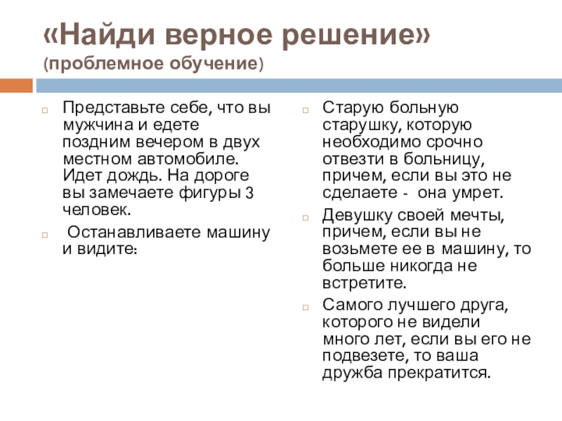 Старую больную старушку, которую необходимо срочно отвезти в больницу, причем, если вы это не сделаете - она умрет.
