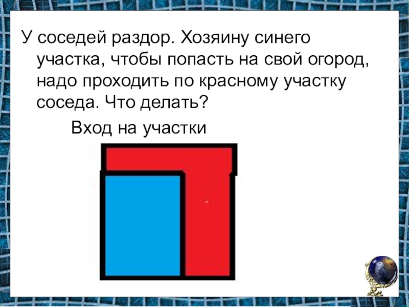 Слайд 21У соседей раздор. Хозяину синего участка, чтобы попасть на свой огород,