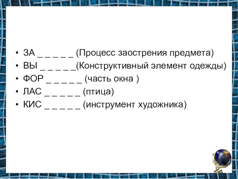 ЗА _ _ _ _ _ (Процесс заострения предмета)