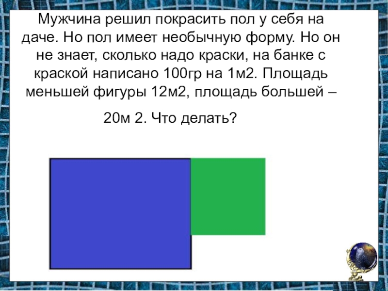 необычную форму. Но он не знает, сколько надо краски, на банке с краской написано 100гр на 1м2. Площадь меньшей фигуры 12м2, площадь большей – 20м 2. Что делать?