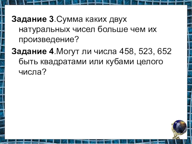 Слайд 18Задание 3.Сумма каких двух натуральных чисел больше чем их произведение?