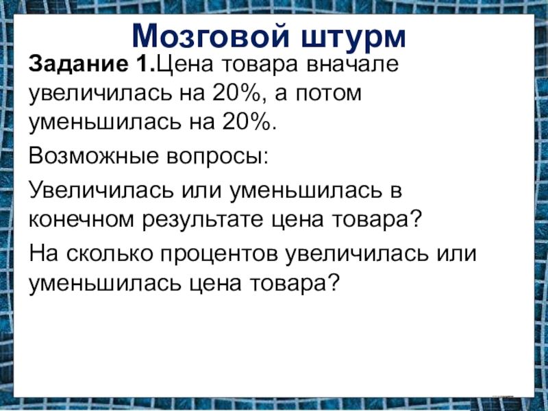 Задание 1.Цена товара вначале увеличилась на 20%, а потом уменьшилась