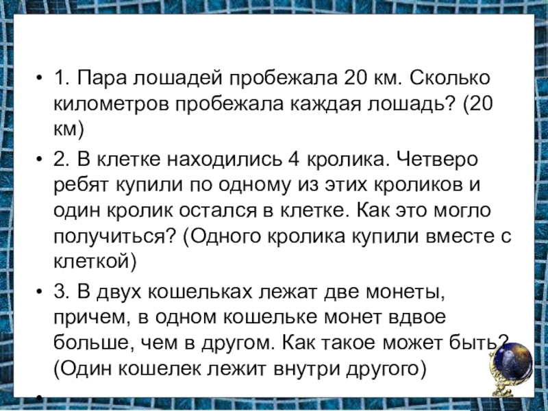 1. Пара лошадей пробежала 20 км. Сколько километров пробежала каждая лошадь?