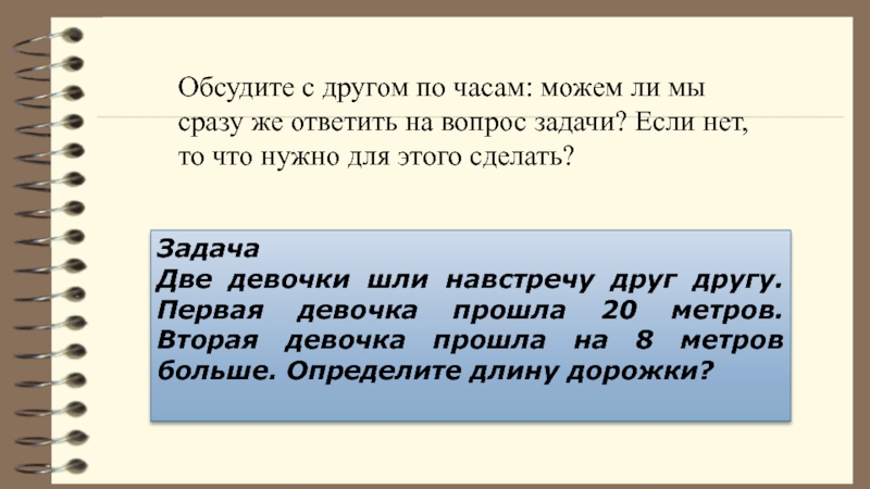 Обсудите с другом по часам: можем ли мы сразу же ответить на вопрос задачи? Если нет, то что нужно для этого сделать?