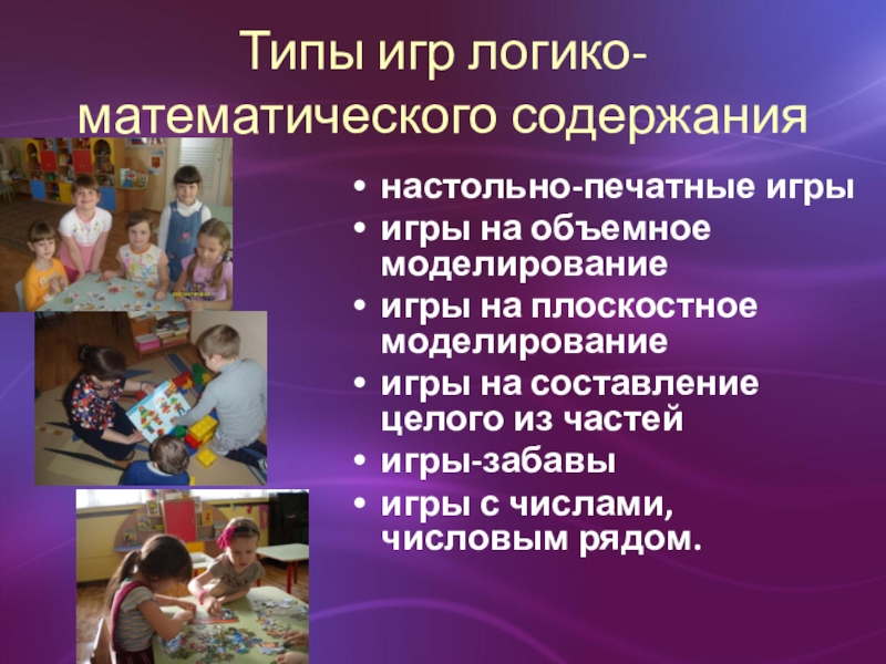 Слайд 6Типы игр логико-математического содержания
