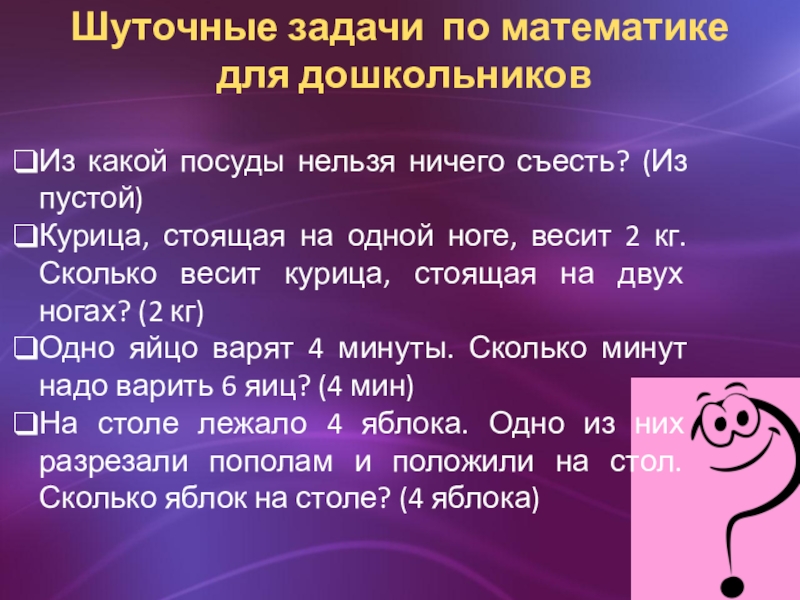 Слайд 26Шуточные задачи по математике