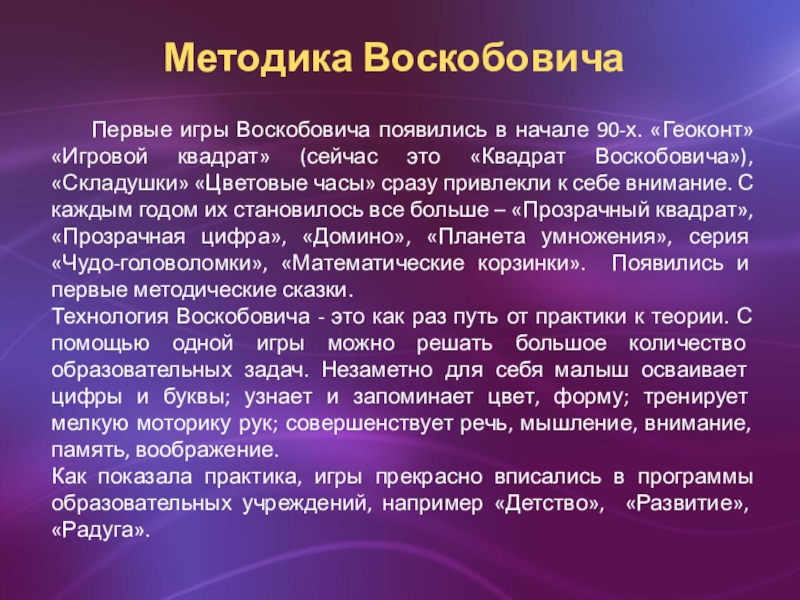 Первые игры Воскобовича появились в начале 90-х. «Геоконт» «Игровой квадрат»