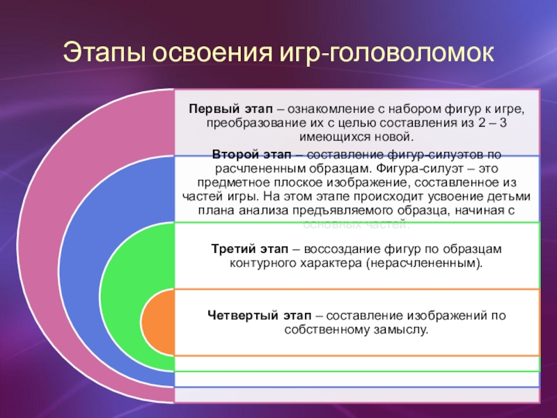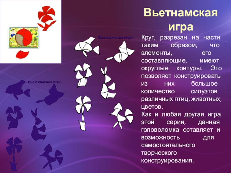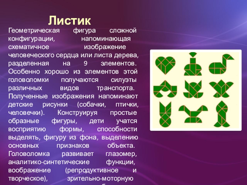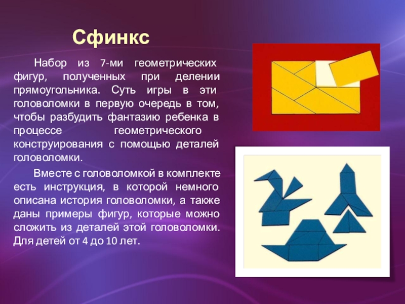 в эти головоломки в первую очередь в том, чтобы разбудить фантазию ребенка в процессе геометрического конструирования с помощью деталей головоломки.