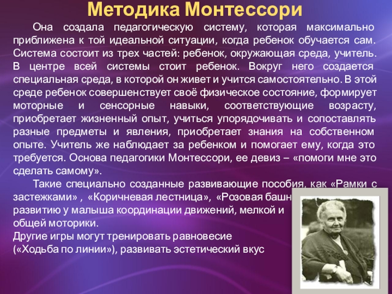 ситуации, когда ребенок обучается сам. Система состоит из трех частей: ребенок, окружающая среда, учитель. В центре всей системы стоит ребенок. Вокруг него создается специальная среда, в которой он живет и учится самостоятельно. В этой среде ребенок совершенствует своё физическое состояние, формирует моторные и сенсорные навыки, соответствующие возрасту, приобретает жизненный опыт, учиться упорядочивать и сопоставлять разные предметы и явления, приобретает знания на собственном опыте. Учитель же наблюдает за ребенком и помогает ему, когда это требуется. Основа педагогики Монтессори, ее девиз – «помоги мне это сделать самому».