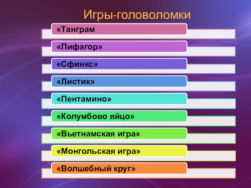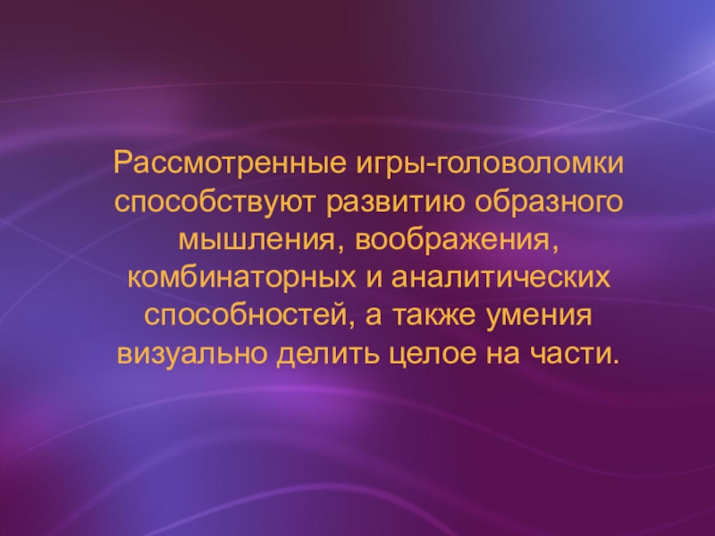 Слайд 18Рассмотренные игры-головоломки способствуют развитию образного мышления, воображения, комбинаторных и аналитических способностей,