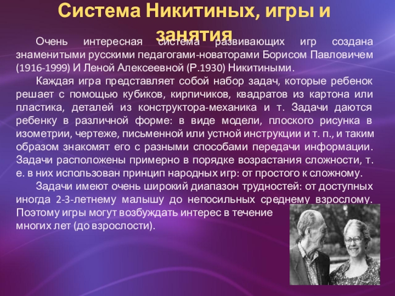 русскими педагогами-новаторами Борисом Павловичем (1916-1999) И Леной Алексеевной (Р.1930) Никитиными.