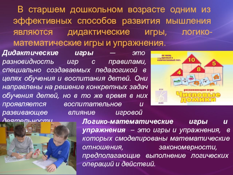 являются дидактические игры, логико-математические игры и упражнения.