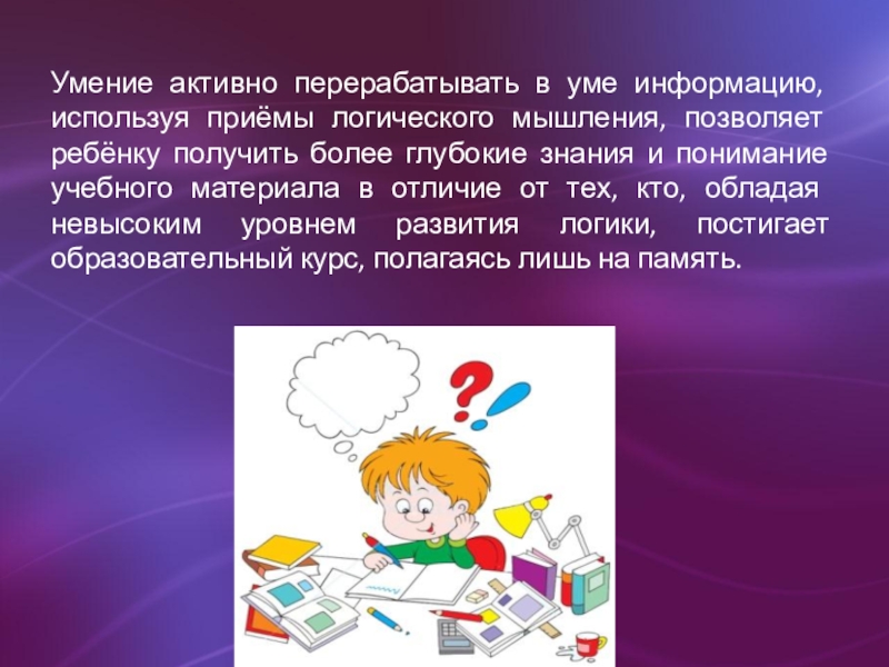 Слайд 3Умение активно перерабатывать в уме информацию, используя приёмы логического мышления, позволяет