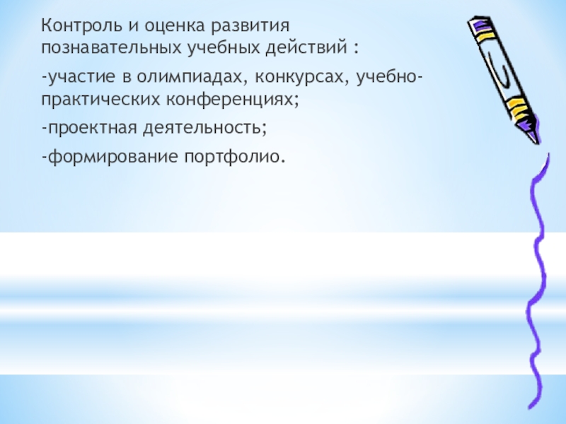 Контроль и оценка развития познавательных учебных действий :-участие в олимпиадах, конкурсах, учебно-практических конференциях;-проектная деятельность;-формирование портфолио.