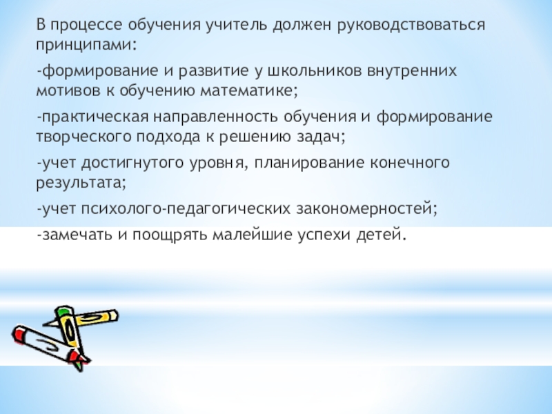 В процессе обучения учитель должен руководствоваться принципами:-формирование и развитие у школьников внутренних мотивов к обучению математике;-практическая направленность